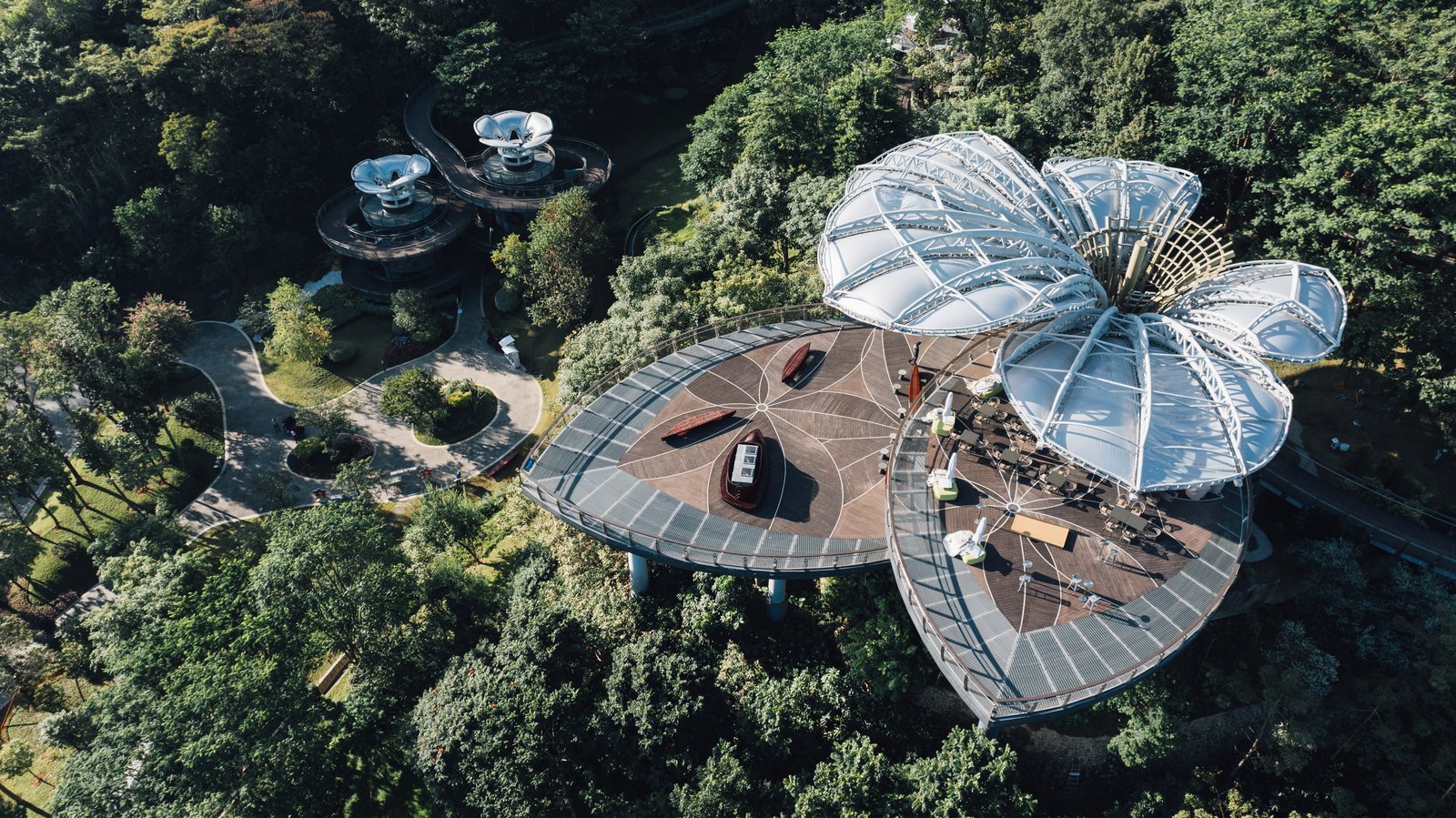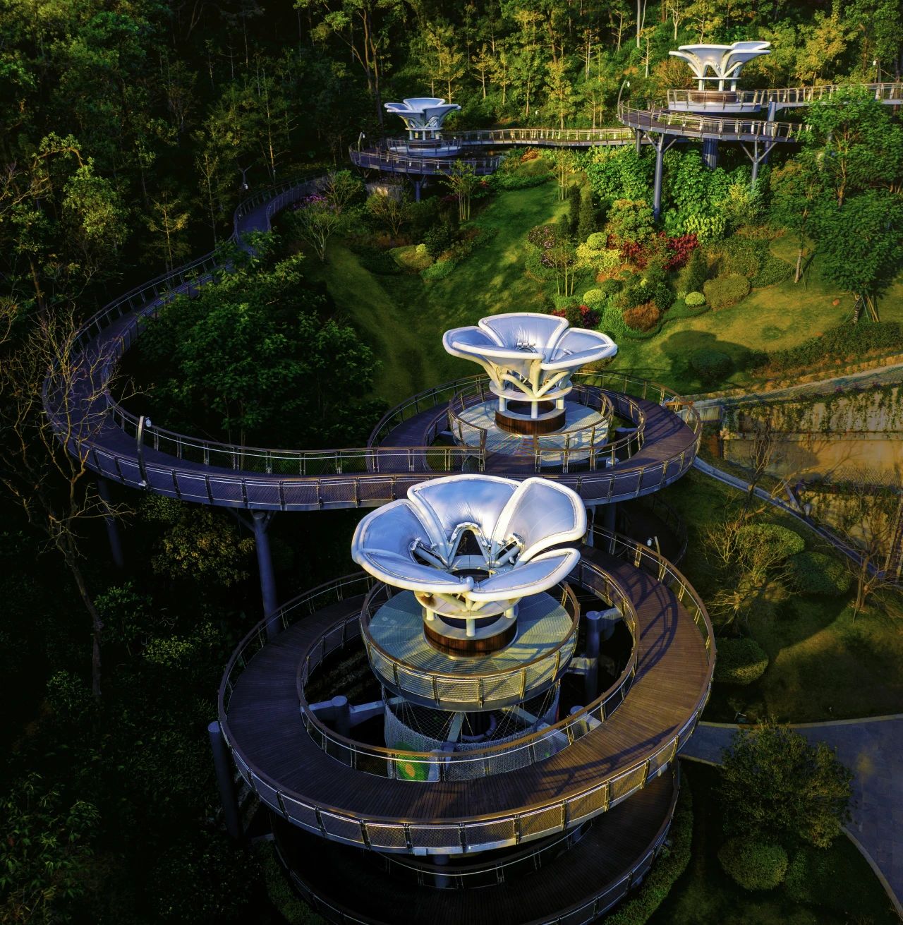 The Guangzhou Kapok Walk features three key design nodes: the White Cloud Pavilion, the Red and White Kapok Skywalk, and the Rainforest Eye Skywalk.