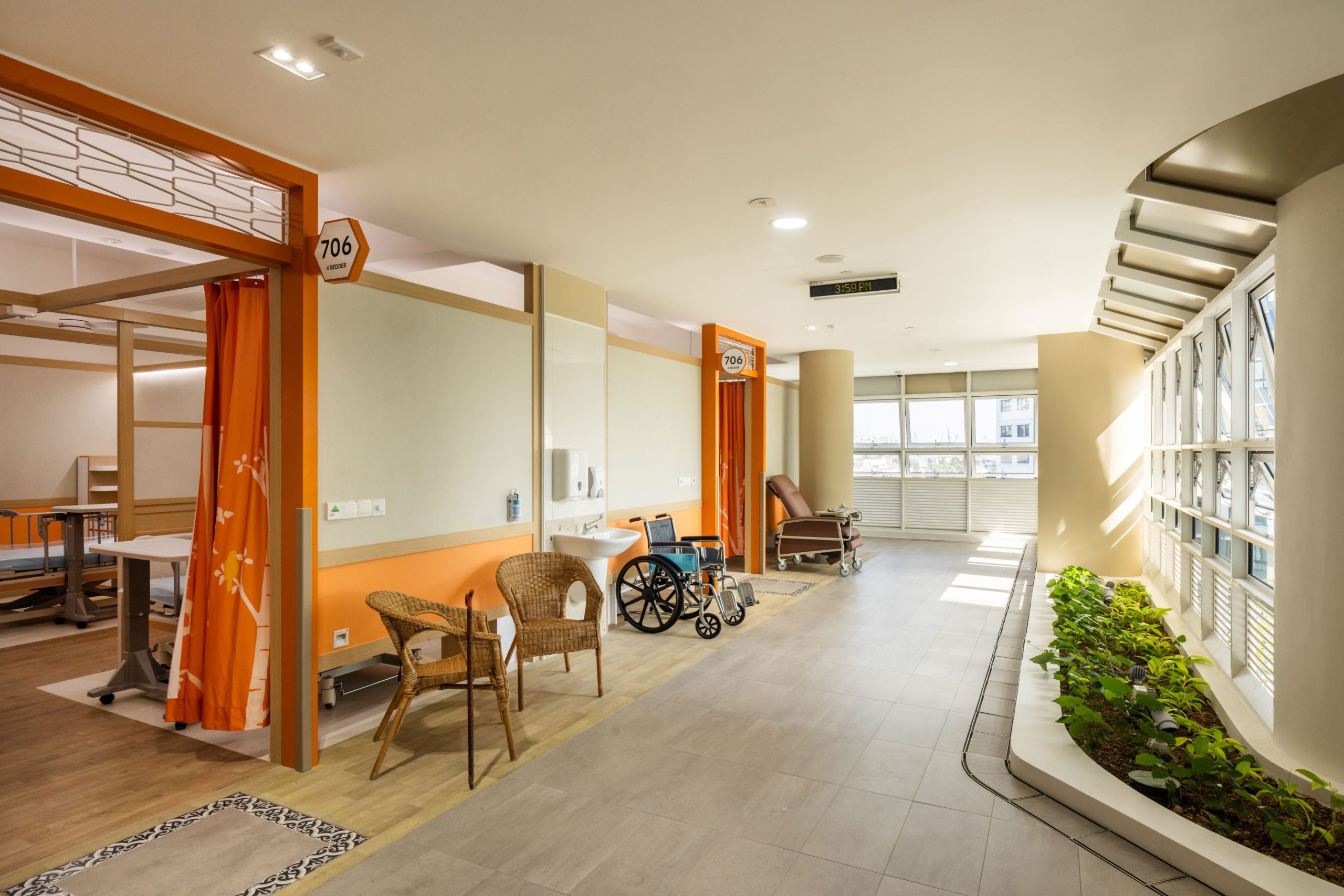 Inclusive compassionate environment within and around the Nursing Home including therapy gardens, wandering areas, reminiscence corners, activity zones, intuitive wayfinding encourages and enables residents to engage in activity for better wellness.